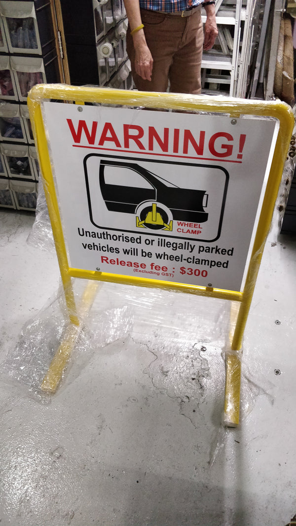 WARNING UNAUTHORISED OR ILLEGALLY PARKED VEHICLE WILL BE WHEEL CLAMPED WITH STANDS