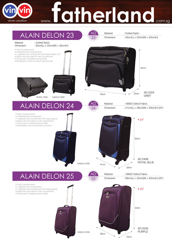 ALAIN DELON 23 Total 3 compartments2 zippered front compartments1 zippered main compartment with laptop sleeve (14”)Zipper with lock holes for main compartmentComes with 2-wheeled internal trolleyRubberized corners to prevent wear...