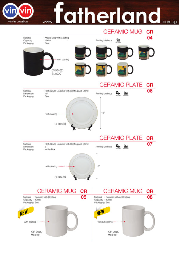 CR 04 CERAMIC MUG Material : Magic Mug with CoatingCapacity : 400mlPackaging : Box Printing Methods Heat TransferCR 05 CERAMIC MUG Material : High Grade Ceramic with Coating and StandDimension : 10”Packaging : Box  Printing Methods Silkscreen Heat...