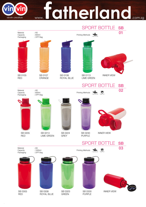 SB 01 SPORT BOTTLEMaterial : ASCapacity : 800mlPackaging : OPP Bag Printing Methods 1 Colour Pad PrintSB 02 SPORT BOTTLEMaterial : ASCapacity : 800mlPackaging : OPP Bag Printing Methods 1 Colour Pad Print, Roller PrintSB 03 SPORT BOTTLEMaterial...