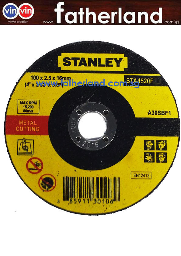 STANLEY CUTTING WHEEL Cutting of steel, iron plates, rebar & weld Good cutting efficiency High quality aluminium oxide grain Reinforced fibreglass for high durability 4 inches x 2.5mm