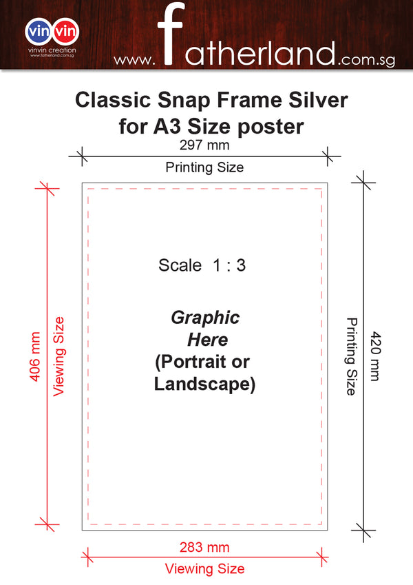 ALUMINIUM SNAP FRAME  A3 ( SILVER )  Snapframes are great for quickly framing up your printed posters and it is also very easy to change posters. Simply snap open the side profiles to...