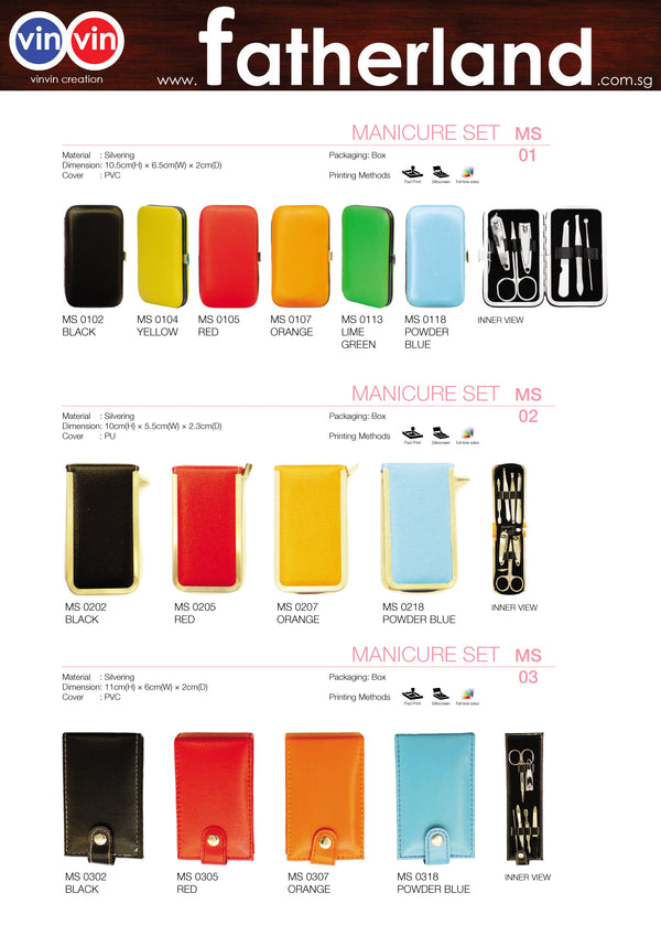 MS 01 MANICURE SETMaterial : SilveringDimension: 10.5cm(H) × 6.5cm(W) × 2cm(D)Cover : PVCPackaging: BoxPrinting Methods Pad Print Silkscreen Full-tone colourMS 02 MANICURE SETMaterial : SilveringDimension: 10cm(H) × 5.5cm(W) × 2.3cm(D)Cover : PUPackaging: BoxPrinting Methods Pad Print...