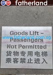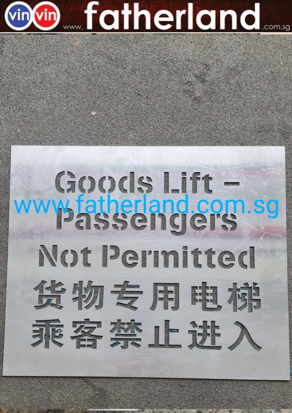 Aluminum or zinc  custom made stencil  Goods Lift Passenger Not Permitted Word : to be advise  FONT : custom  Size : quote based on requirement   Thank you for visiting www.fatherland.com.sg....