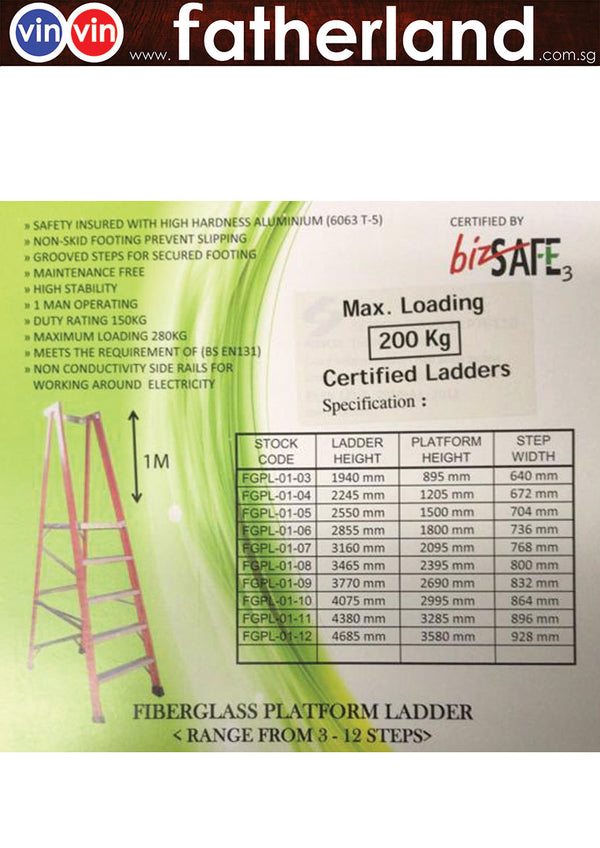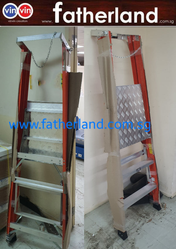 FIBREGLASS PLATFORM LADDER 6 Steps Picture Steps for Reference Only Item May varies  3 steps to 11 steps (step to step 304.8mm) 6 Steps Weight is 16.7kg +- Safety Insured...
