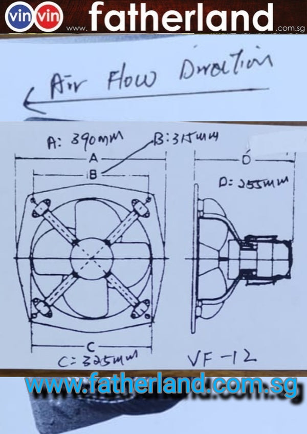 Xinda  INDUSTRIAL EXHAUST FAN 12 Inches Blade with wire mesh  Inches  MODEL :VF-12 Thank you for visiting www.fatherland.com.sg.  For Bulk Wholesale and Project Purchase, kindly email to ilovefatherland@gmail.com for more...