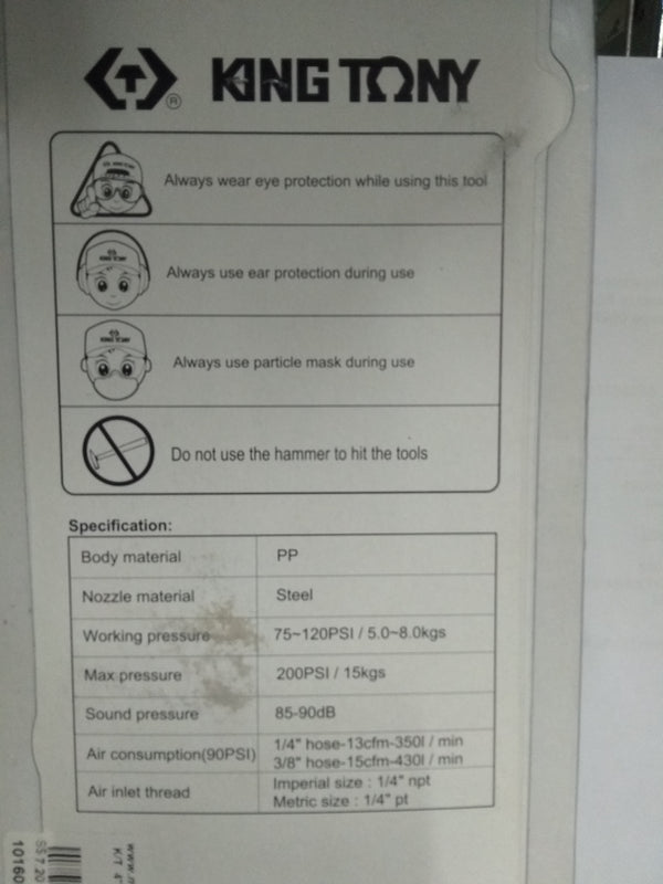 Air Blow Gun Ideal for cleaning Steel nozzle & nylon fiber handle Air pressure: 90 psi recommended Air consumption:1/4” hose-13cfm-350I/min3/8” hose-15cfm-430I/min Sound pressure: 85~90 dB Working pressure:75~120 PSI / 5.3~8.4...