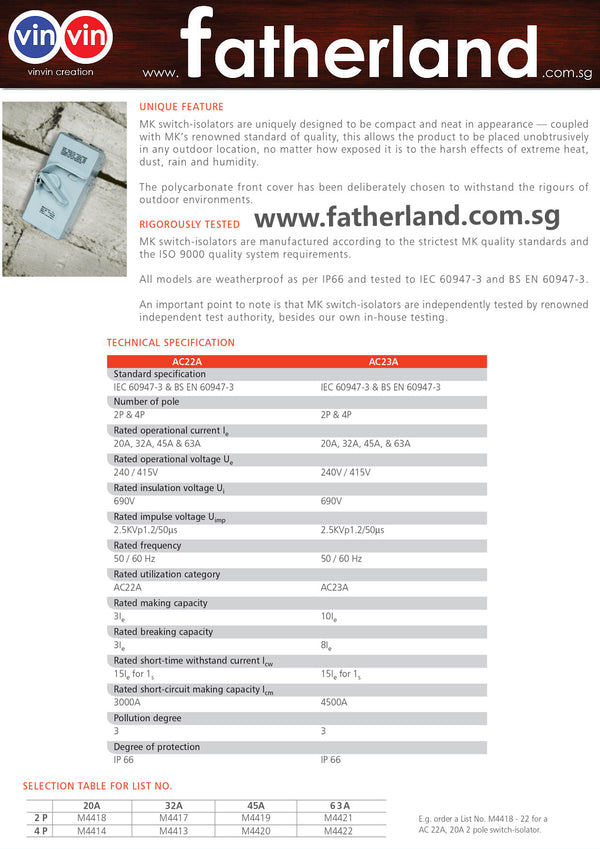 Mk Isolator M4420-23: 45A Tpn Isolator Wp Gry-8Nos Pipe Wrch 12I Spw300 MK switch-isolators are uniquely designed to be compact and neat in appearance — coupled with MK’s renowned standard...