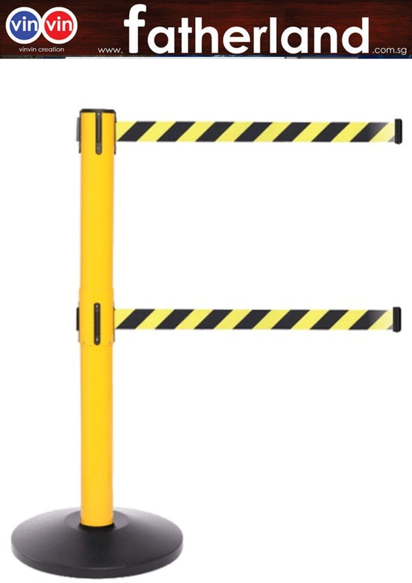This Double-Belt Retractable Queue Pole is a high-visibility crowd control solution designed for environments that require enhanced security and clear boundary marking. Featuring a striking yellow and black color scheme, this stanchion is engineered for both functionality and durability in high-traffic industrial or commercial settings.