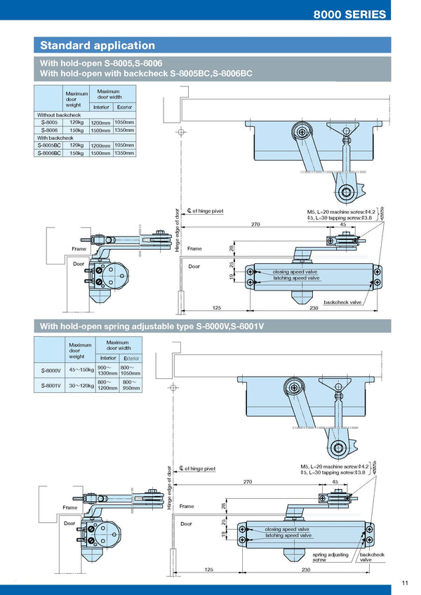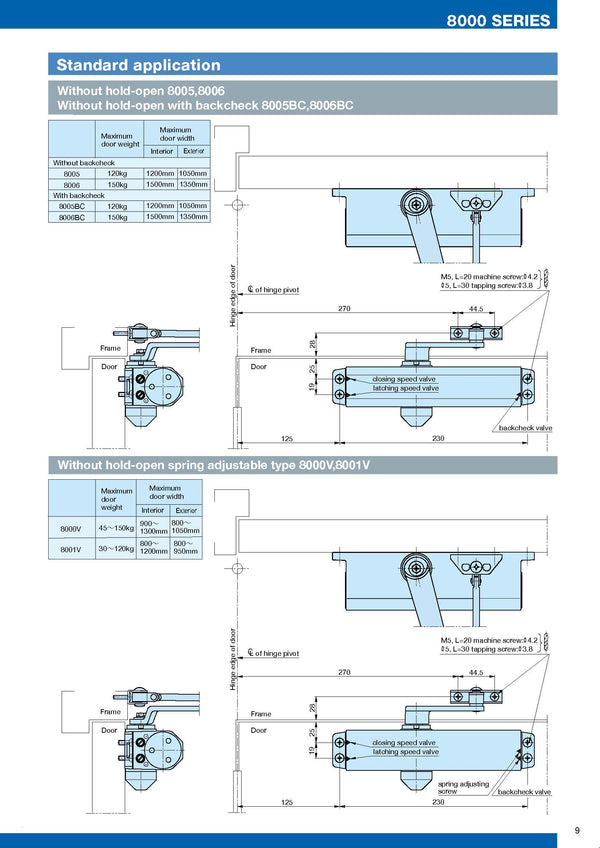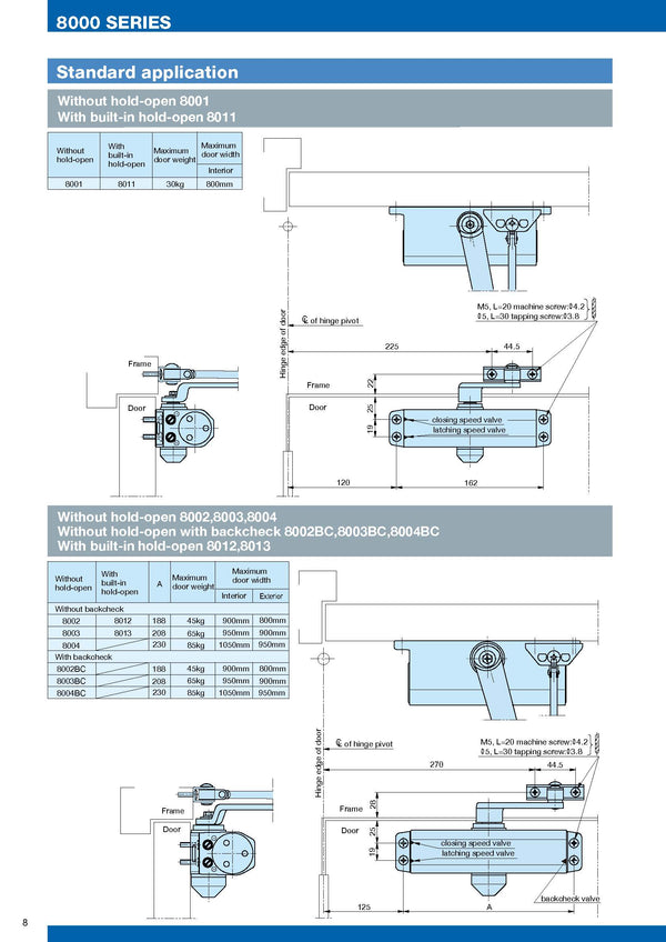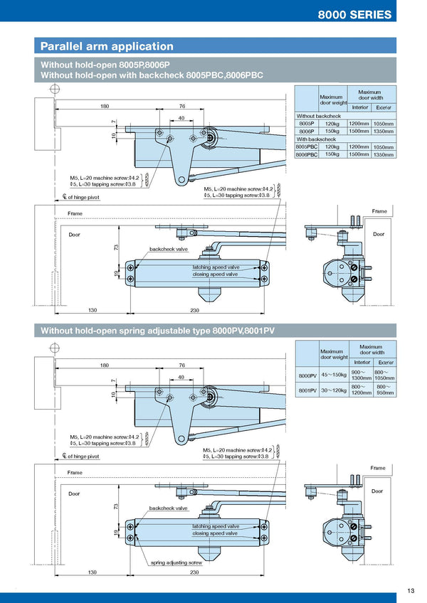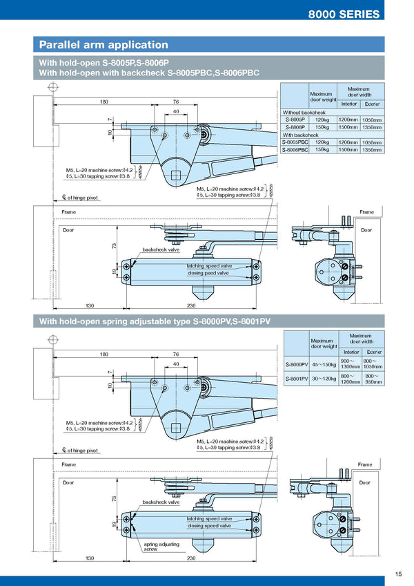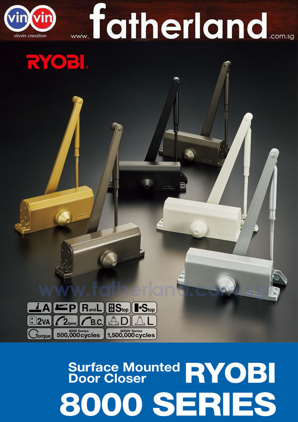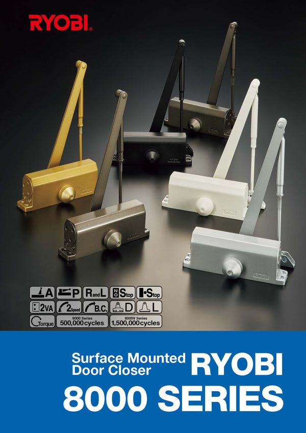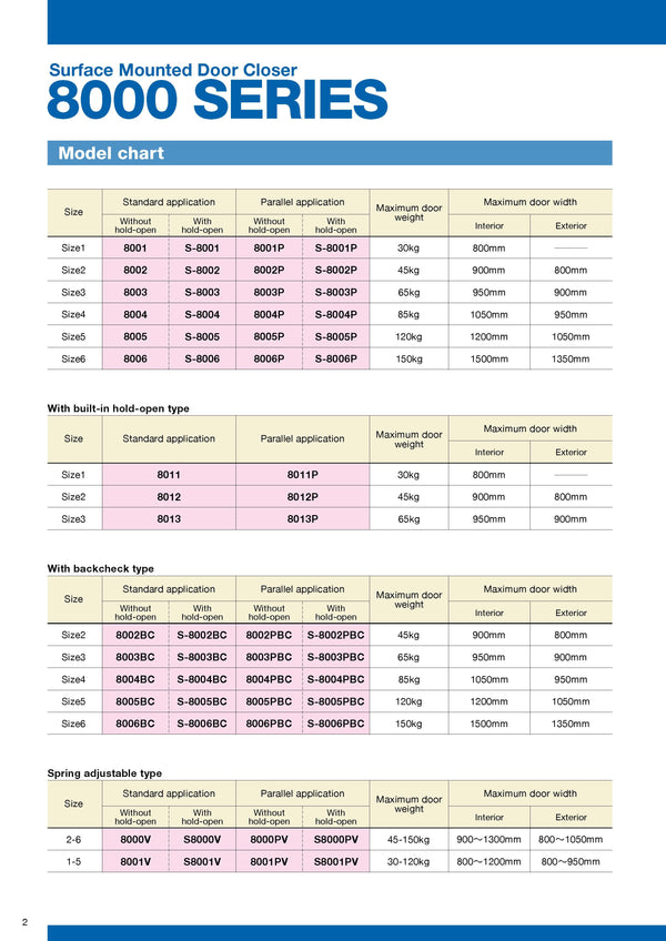 RYOBI. Surface Mounted. Door Closer. 500,000cycles. 8000 Series. 1,500,000 ... Maximum door weight. Maximum door width. Standard application. Without hold- ... 45kg. 65kg. 85kg. 120kg. 150kg. 8001. 8002. 8003. 8004. 8005. 8006. 8001P ... S-8005. S-8006. Model chart. Co. Interior. Exterior. Interior. Exterior. Interior.