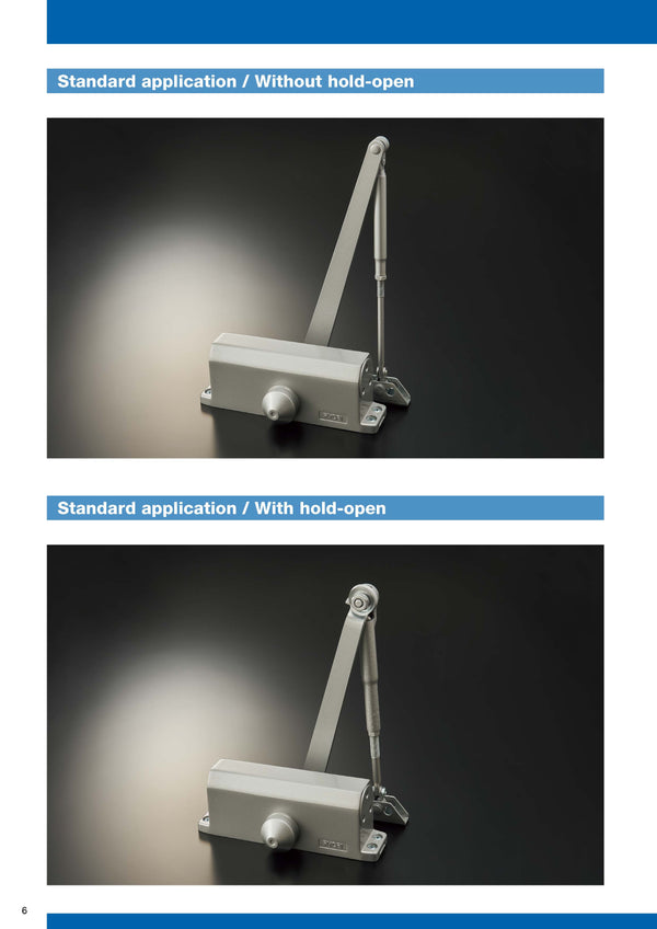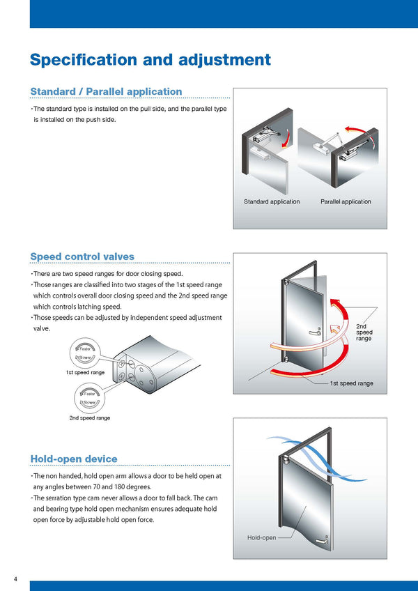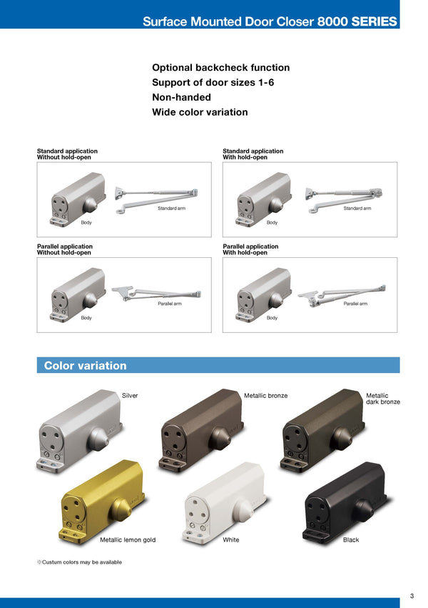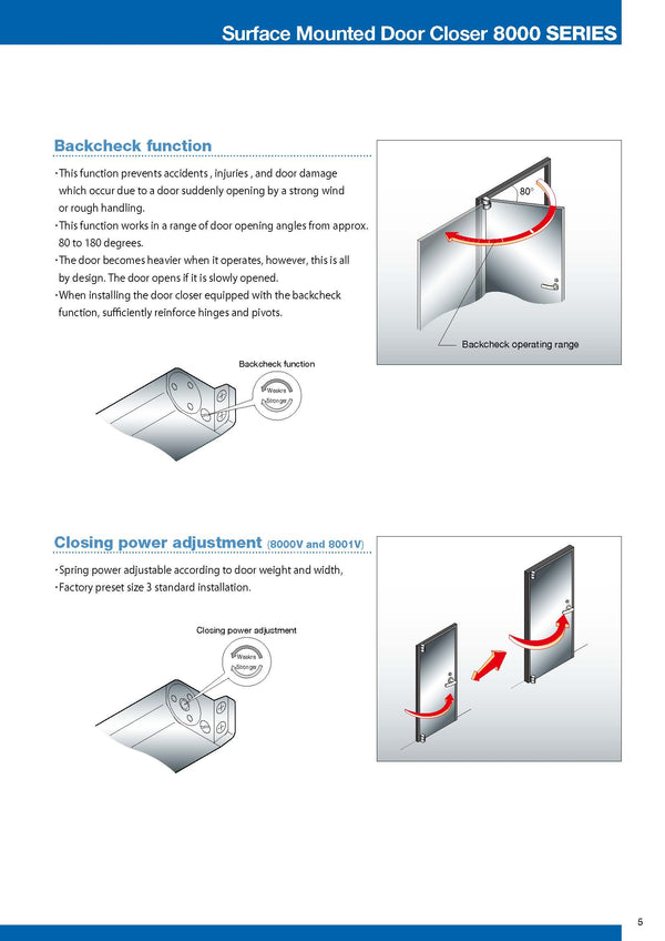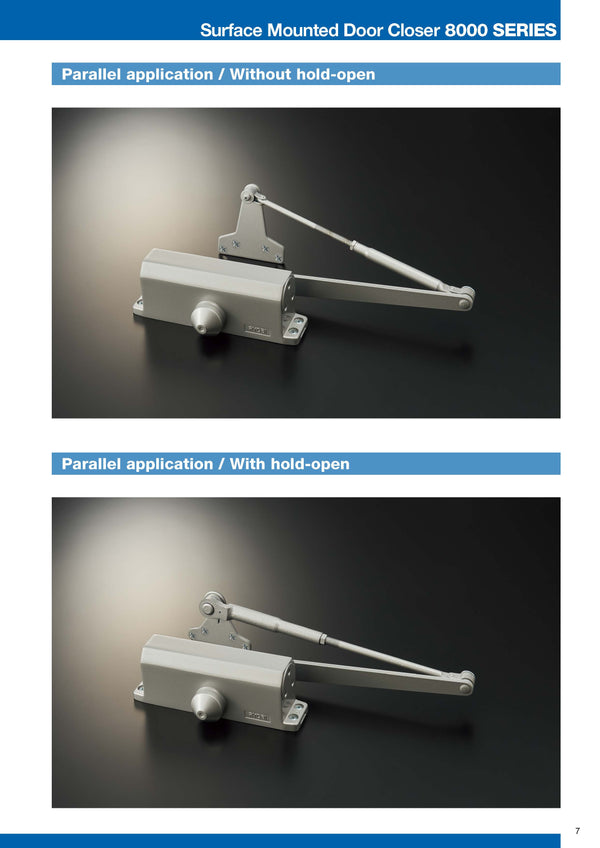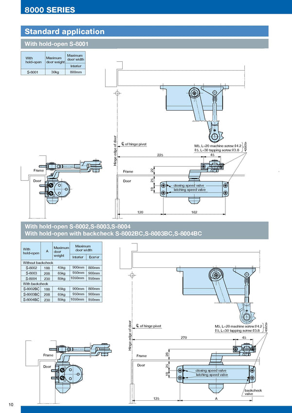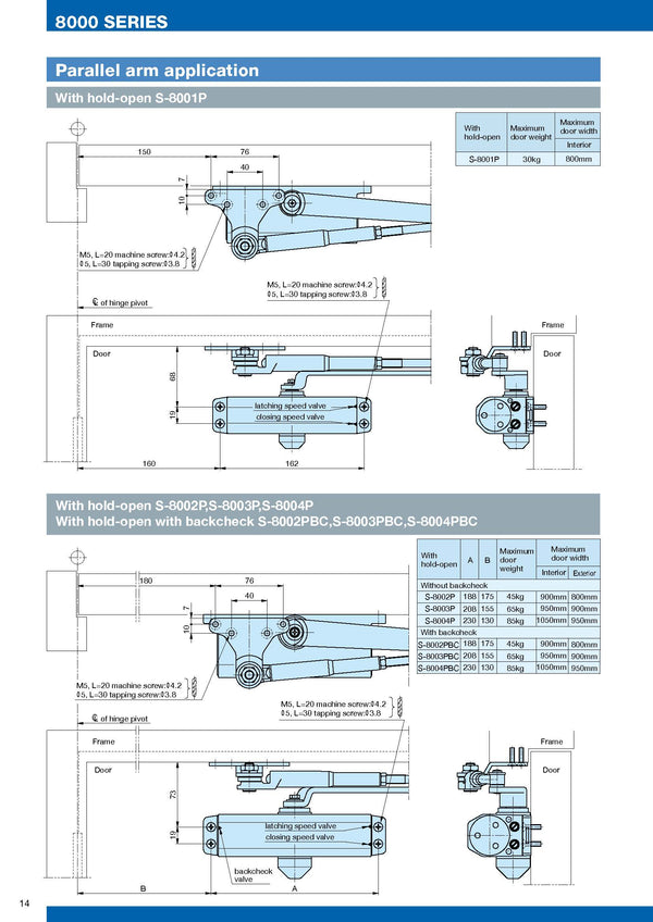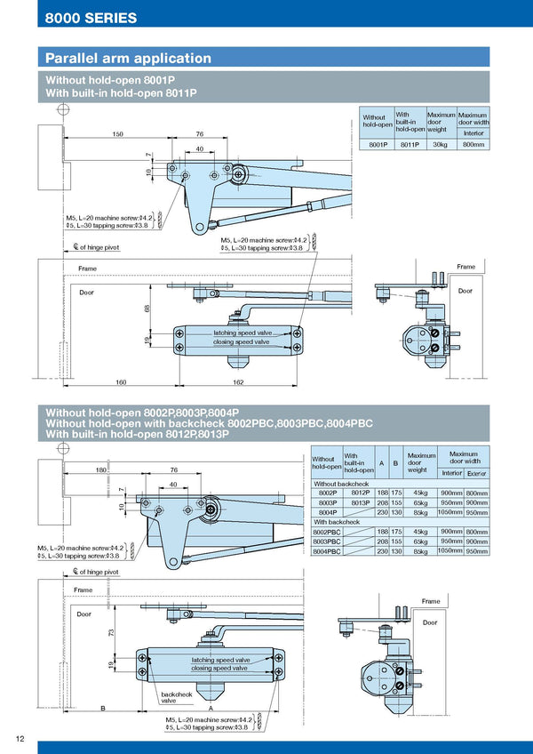 RYOBI. Surface Mounted. Door Closer. 500,000cycles. 8000 Series. 1,500,000 ... Maximum door weight. Maximum door width. Standard application. Without hold- ... 45kg. 65kg. 85kg. 120kg. 150kg. 8001. 8002. 8003. 8004. 8005. 8006. 8001P ... S-8005. S-8006. Model chart. Co. Interior. Exterior. Interior. Exterior. Interior.