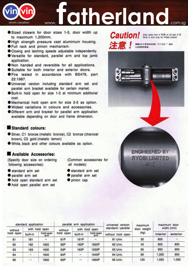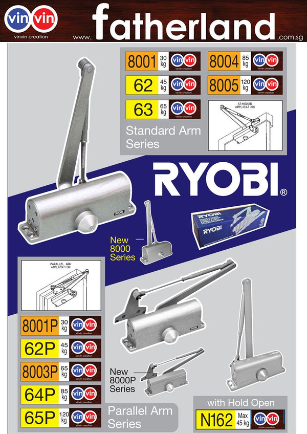 RYOBI DOOR CLOSER SILVER 8002 (STANDARD ARM) RYOBI. Surface Mounted. Door Closer. 500,000cycles. 8000 Series. 1,500,000 ... Maximum door weight. Maximum door width. Standard application. Without hold- ... 45kg. 65kg....