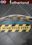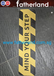 The "MIND YOUR STEP" tape in the image exemplifies a common application: marking transition areas, steps, ramps, or any location where a change in elevation or surface could lead to a stumble. The prominent black and yellow chevrons are universally recognized as a warning sign, immediately alerting pedestrians to exercise caution.