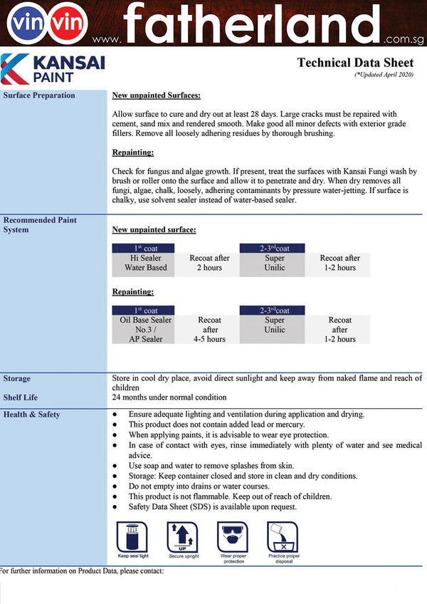 Kansai Paint Super Unilic Bs10B15 20Lit Product Description Product Description An acrylic emulsion paint with excellent resistance to algae and fungus growth. Complies to Singapore Standard ( SS345:1990 )Complies to...