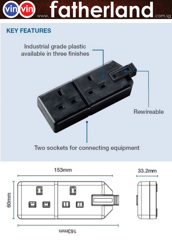 Heavy Duty Double Socket Rewireable  Industrial Grade Plastic  Two Socket for connecting equipment  Model : PE2GHD 13A Multi Socket  Thank you for visiting www.fatherland.com.sg. For Retail Experience. Kindly visit our dealer  For...