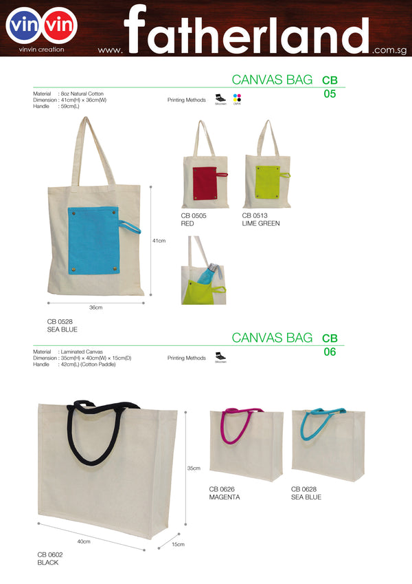 CB  05 CANVAS BAGMaterial : 8oz Natural CottonDimension : 41cm(H) × 36cm(W)Handle : 59cm(L)Printing Methods Silkscreen CMYK EmbroideryCB  06 CANVAS BAGMaterial : Laminated CanvasDimension : 35cm(H) × 40cm(W) × 15cm(D)Handle : 42cm(L) (Cotton...