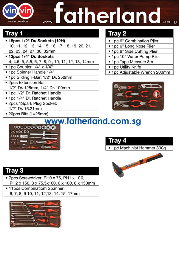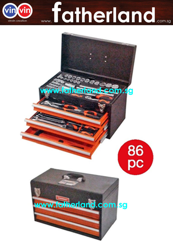 KENDO KD-90517 86 pcs Chest Set Size : 460x240x280mm Tray 1:1 300g technical hammerTray 2:18 pcs of: 10,11,12,13,14,15,16,17,18,19,20,21,22,23,24,27,30,32mm tubes.13: 4.45, 5.55, 6, 7, 8, 9, 10, 11, 12, 13, 14mm.1...