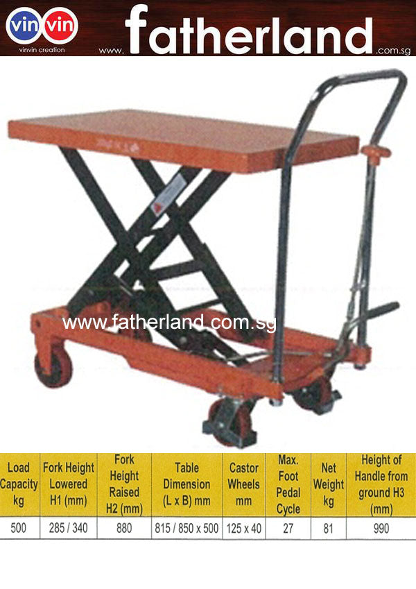 Specification : Load Capacity: 500kg Max. Height: (Raised): 900mm Min. Height